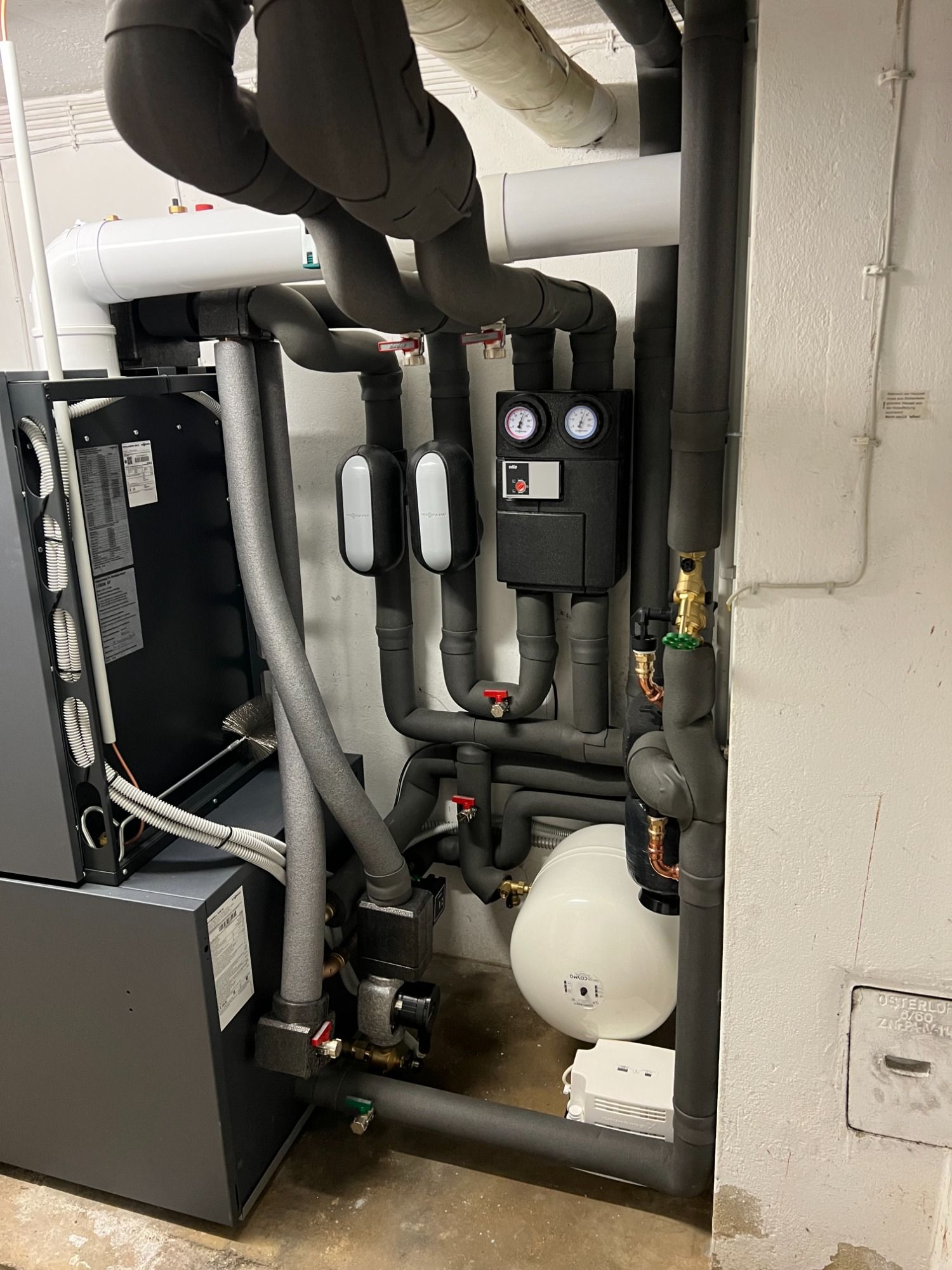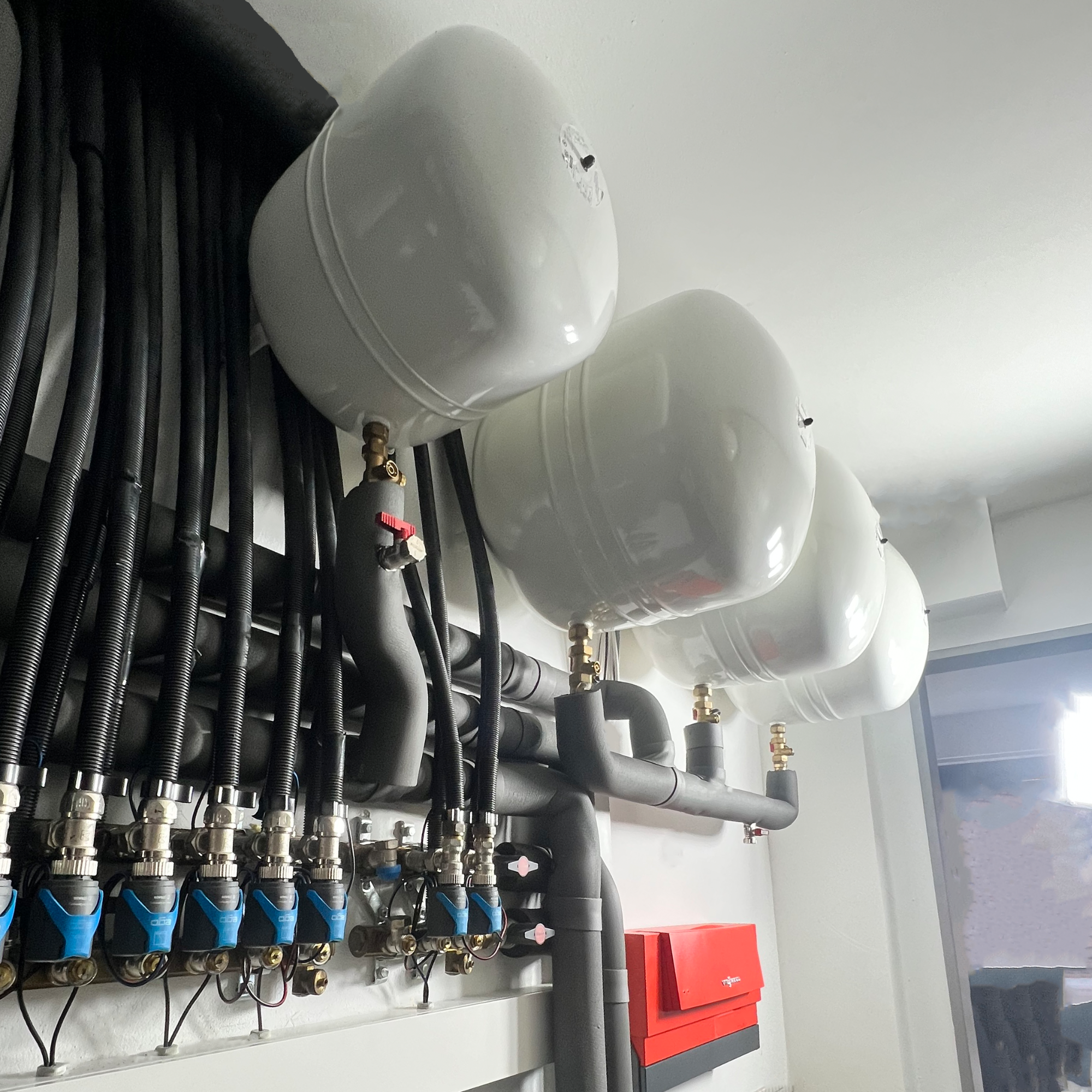 Viessmann Wärmepumpe (Sole/Wasser über Tiefenbohrungen) mit zwei Pufferspeichern, einer Frischwasserstation und einer aktiven Kühlung über die Flächenheizung.