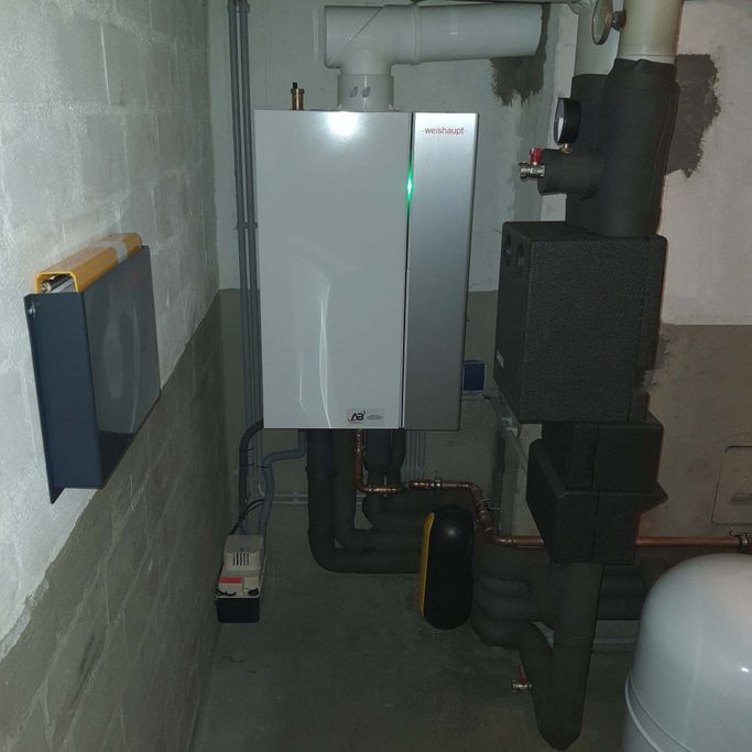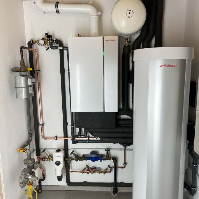 Gas-Hybridheizung bestehend aus einer Weishaupt Split-Wärmepumpe (Luft/Wasser) einer Weishaupt Gasbrennwerttherme zur Abdeckung der Spitzenlast und Effizienzsteigerung der Wärmpumpe sowie einem Trinkwasserspeicher mit zwei Rohrwendelwärmetauschern.